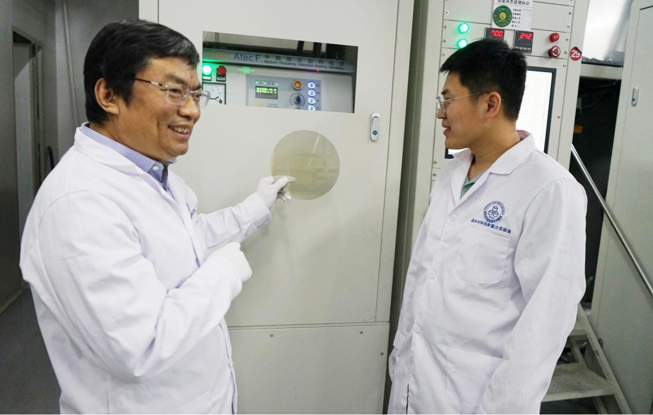 图:徐现刚教授与任务组成员讨论刚刚突破的8英寸碳化硅单晶衬底