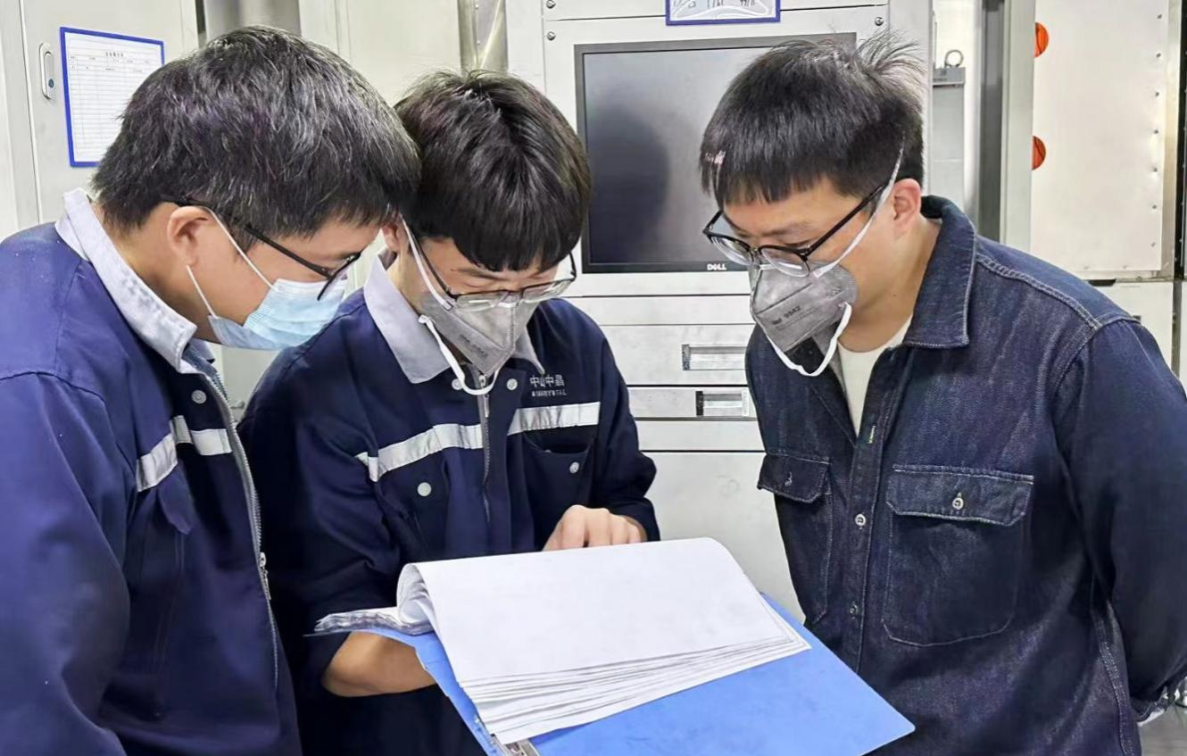 图:碳化硅任务组成员正在查阅导电型碳化硅晶体生长记录单