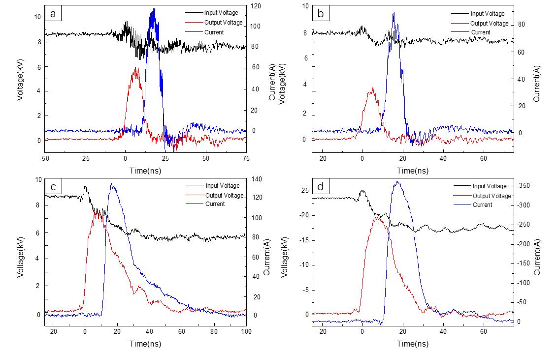 图2: SiC光导开关导通波形图(a) VD 4H-SiC PCSS (b)VD 6H-SiC PCSS (c) HP 4H-SiC PCSS (d) HP 4H-SiC PCSS(偏压24kV)