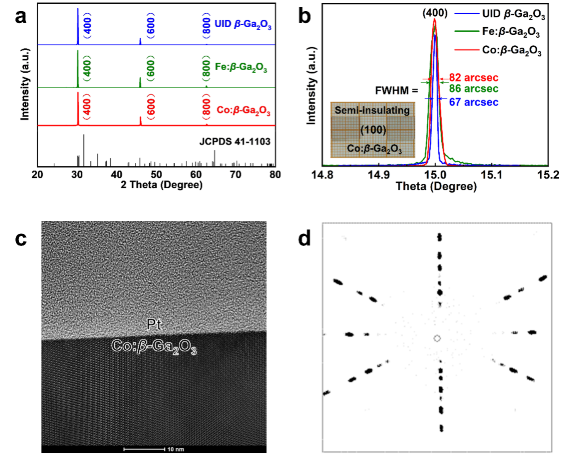 如图1所示,该团队所生长的Co掺杂半绝缘β-Ga2O3单晶衬底摇摆曲线半峰宽为86 arcsec,低于Fe掺杂衬底样品的86 arcsec,且Co掺杂衬底样品的高分辨透射电子显微镜横截面图像(图1c)进一步显示出有序的晶格排列,其劳厄衍射斑点(图1d)清晰对称,表明Co掺杂半绝缘β-Ga2O3单晶拥有良好结晶质量。