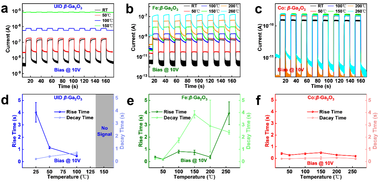 如图5所示,进一步通过多个循环的I-T曲线直观的表示出Co掺杂衬底样品的半绝缘效应稳定性,同时,通过引入不同温度点条件下的多循环误差棒,对比图5e和5f可知,Co掺杂衬底样品的上升下降时间及误差均保持稳定,而Fe掺杂衬底样品于测试温度区间内表现出较大误差,说明了该衬底的半绝缘效应随温度升高出现了恶化现象。综上所述,与传统的Fe掺杂半绝缘β-Ga2O3衬底相比,新型Co掺杂半绝缘β-Ga2O3衬底较好的解决了高温工作条件下半绝缘效应失效问题,该衬底在β-Ga2O3基的深紫外日盲探测器件、功率器件、电力电子器件的高温应用领域具备广阔应用潜力。