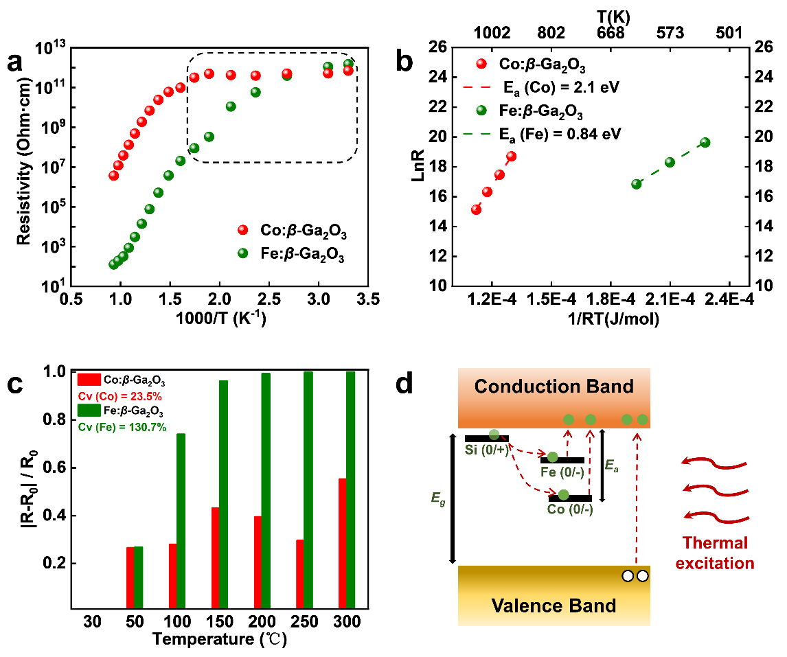 如图3所示,与Fe掺杂衬底样品不同,Co掺杂衬底样品在室温到300℃的温度区间内出现了一个高电阻率(~1012Ω·cm)平台(图3a),图3b通过进一步拟合电阻率数据结果分别得到Co和Fe的受主能级分别为2.1 eV,0.84 eV,结果证明深能级受主Co更接近带隙中间位置。图3c通过计算获得了两种半绝缘衬底样品室温到300℃的电阻率牺牲率和波动系数(Cv),更直观的表达了Co掺杂衬底样品高阻稳定性,同时,图3d展现了不同能级深度的受主掺杂离子和部分施主掺杂离子于β-Ga2O3能带结构中的热激发过程。
