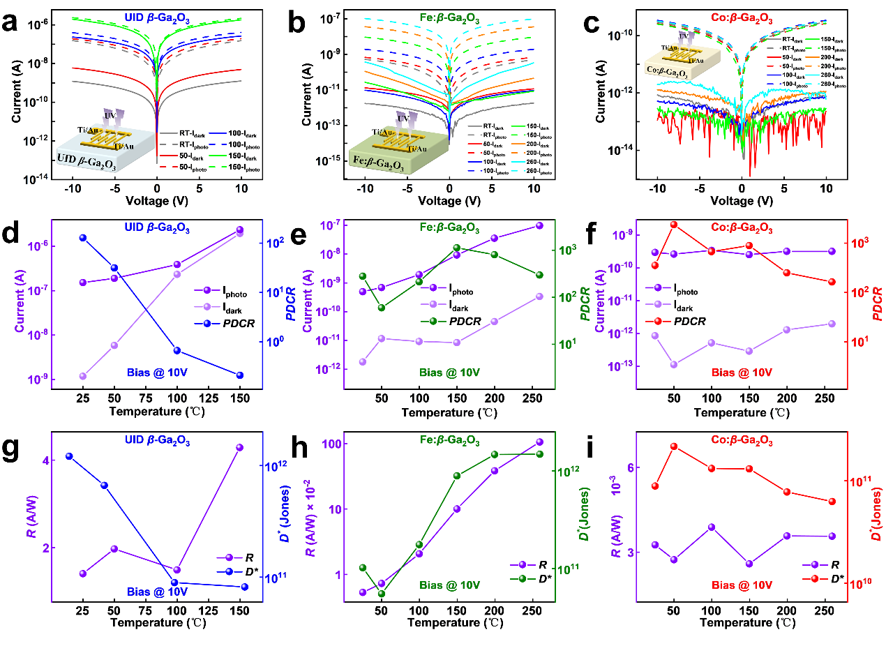 如图4所示,该团队制备了基于不同衬底样品的深紫外日盲光电探测器,并进行了一系列变温光响应测试器件性能,用以验证Co掺杂衬底的高温工作稳定性。与基于非故意掺杂及Fe掺杂衬底样品的探测器性能表现不同,基于Co掺杂衬底样品的探测器在整个测试温度区间(室温至260℃)内保持较低水平的暗电流,参照样随温度升高,均表现出较大的暗电流增大,其中基于非故意掺杂衬底样品的探测器于150℃失去探测能力,基于Fe掺杂衬底样品的探测器暗电流控制较差。因此,基于Fe掺杂衬底样品的探测器性能参数(响应度、比探测率)在测试区间呈现提高趋势,而基于Co掺杂衬底样品的探测器性能参数保持稳定,该结果表明Co掺杂衬底样品的半绝缘效应在整个测试温度区间保持良好,间接证明了Co掺杂衬底的高温稳定性。